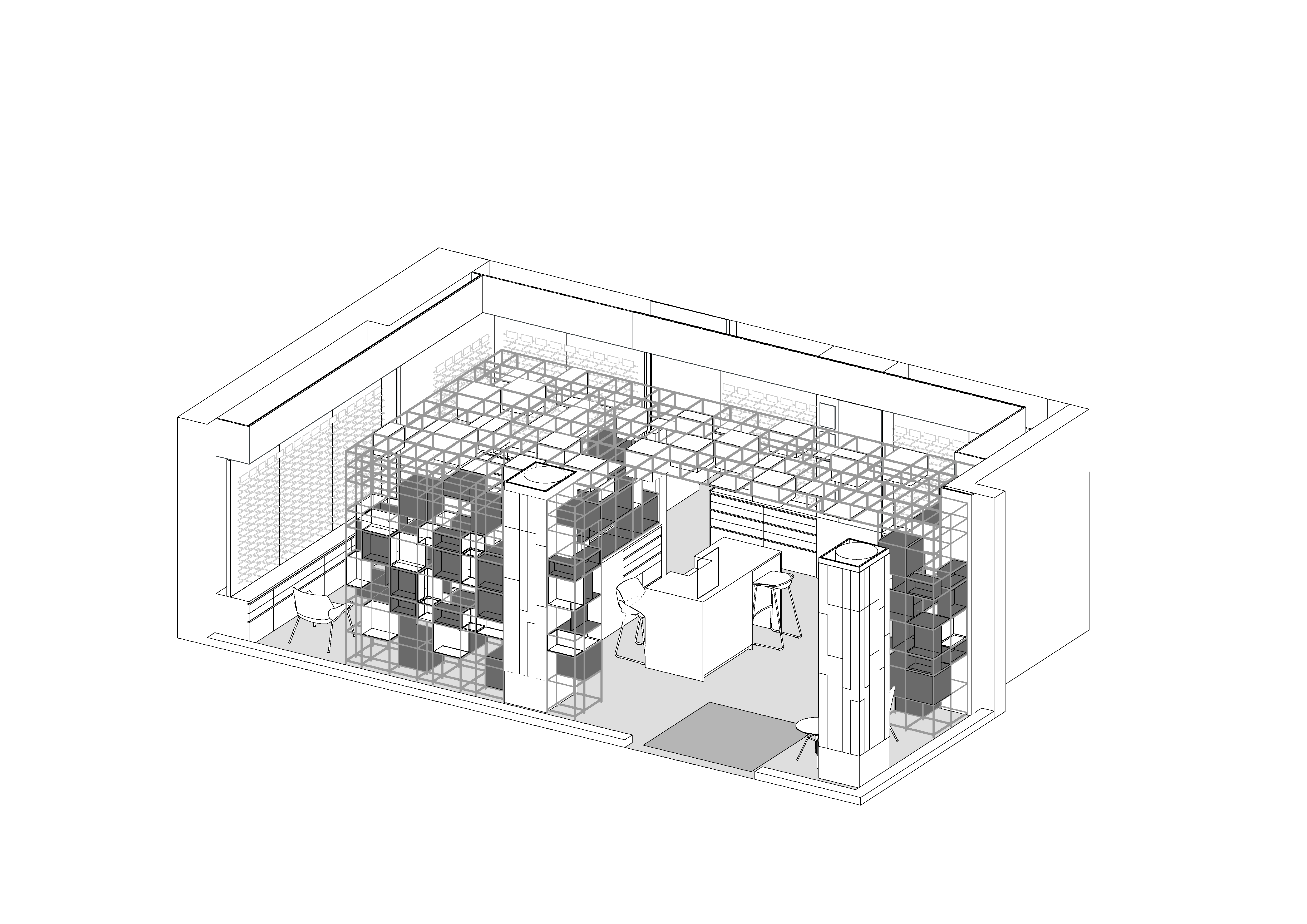 Središnji prostorni motiv čini aluminijska konstrukcija koja se proteže vertikalno kroz centralni dio interijera, od poda do stropa. Ona funkcionira kao trodimenzionalna mreža unutar koje su pozicionirani izložbeni kubusi različitih formata, u ritmičnom odnosu s rasvjetnim elementima i visećim zelenilom. Ovaj čelični grid artikulira prostor, stvara vizualni ritam i prostornu dinamiku te definira prepoznatljiv identitet interijera.